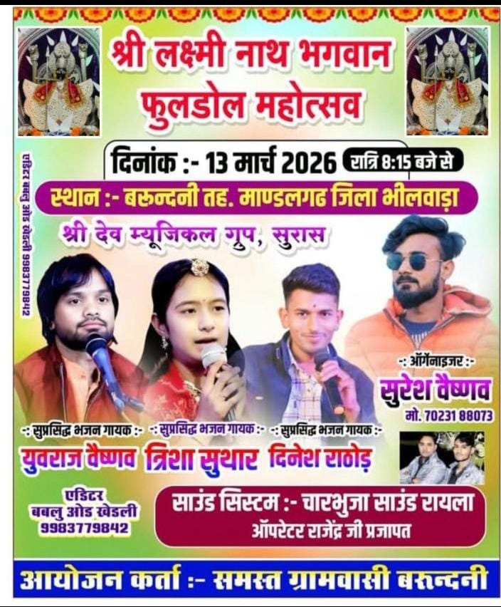 बरूंदनी में 13 मार्च को श्री लक्ष्मीनाथ भगवान का फूलडोल महोत्सव का आयोजन होगा